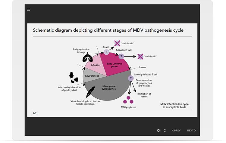 This eLearning course, designed in collaboration with subject matter experts in the MDV WOAH reference laboratory at Pirbright, is intended to broaden participants’ understanding of MD, and the virus which causes it. The course specifically focuses on information that would be useful for vets or laboratory staff undertaking laboratory diagnostic testing for MDV.