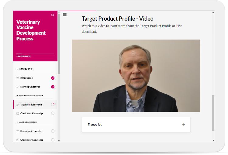 The course is primarily aimed at academic researchers having a basic knowledge of virology and vaccinology with more interactive learning materials provided for the early phases of vaccine development during which academia is more involved. However, as it provides a complete overview it will be helpful for anyone wishing to gain an overview of veterinary vaccine development.