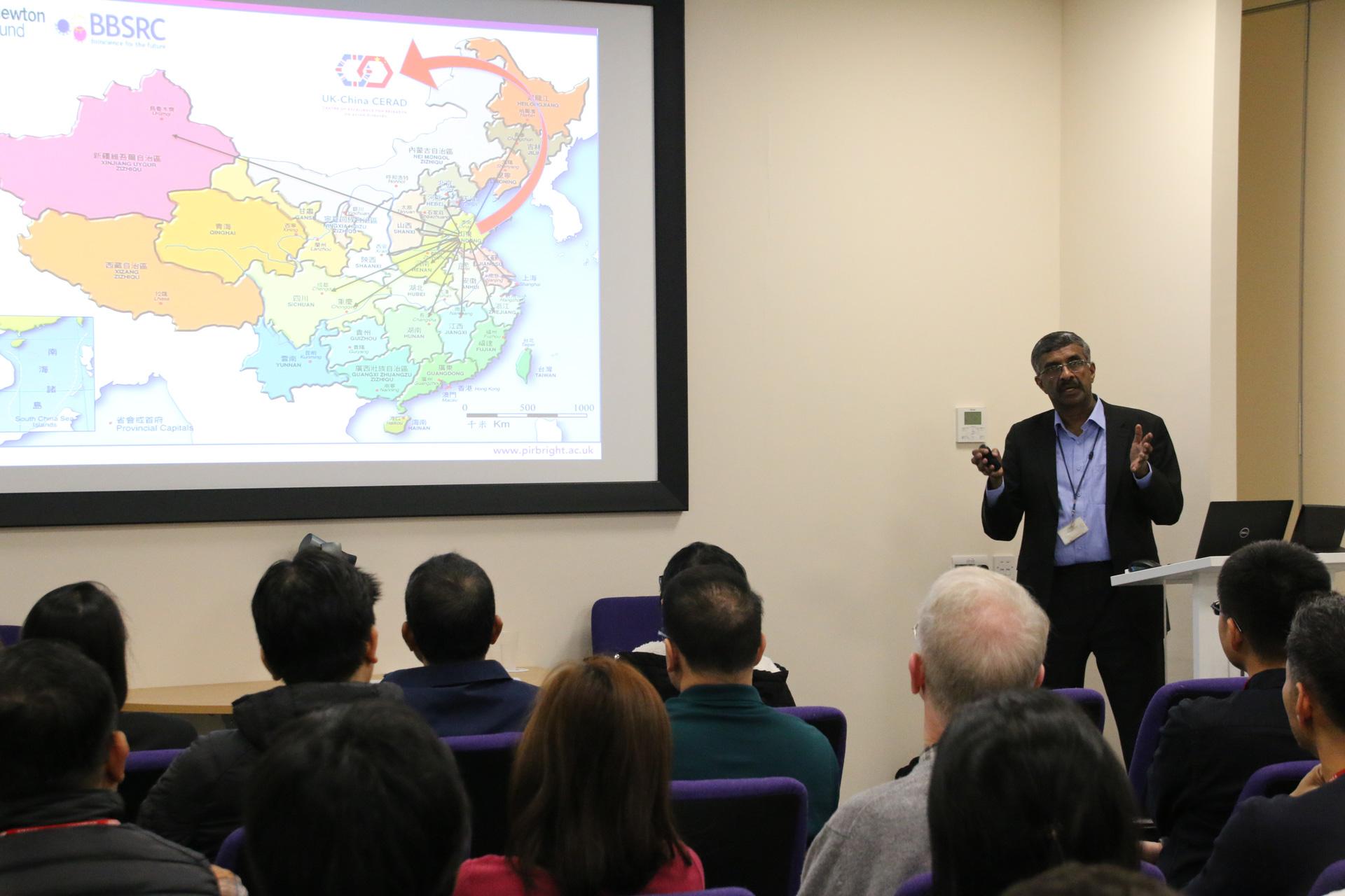 Photo: Professor Venugopal Nair OBE addresses delegates of the Newton Fund Swine and Poultry Research Initiative during their visit to The Pirbright Institute on 15 January 2020.